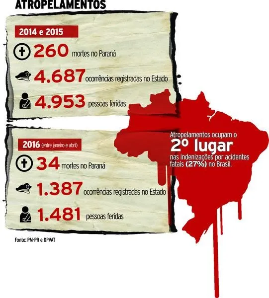 Nos últimos dois anos, o número de mortes em atropelamentos no Paraná teve um aumento de 3,13%. Em 2014, foram 128 mortes pelo mesmo motivo. Já em 2015 foram 132 pedestres fatalmente feridos. Ao todo, foram 4.687 ocorrências registradas no Estado, com 4.953 feridos. Em Apucarana e Arapongas, foram 85 ocorrências de atropelamentos em 2015, segundo dados da Polícia Militar (PM).