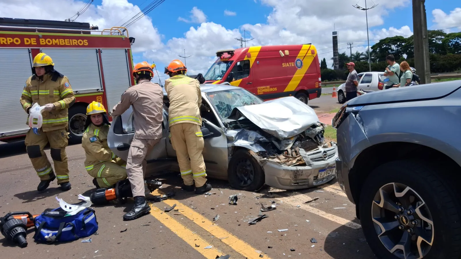 Três pessoas estavam no Celta. O motorista disse que eles são de Sertanópolis e trabalham em uma granja em Arapongas. O condutor sofreu um ferimento na cabeça, enquanto os outros dois precisaram de maior atenção. O passageiro ficou encarcerado no veículo. Eles foram encaminhados para a Unidade de Pronto Atendimento (UPA).