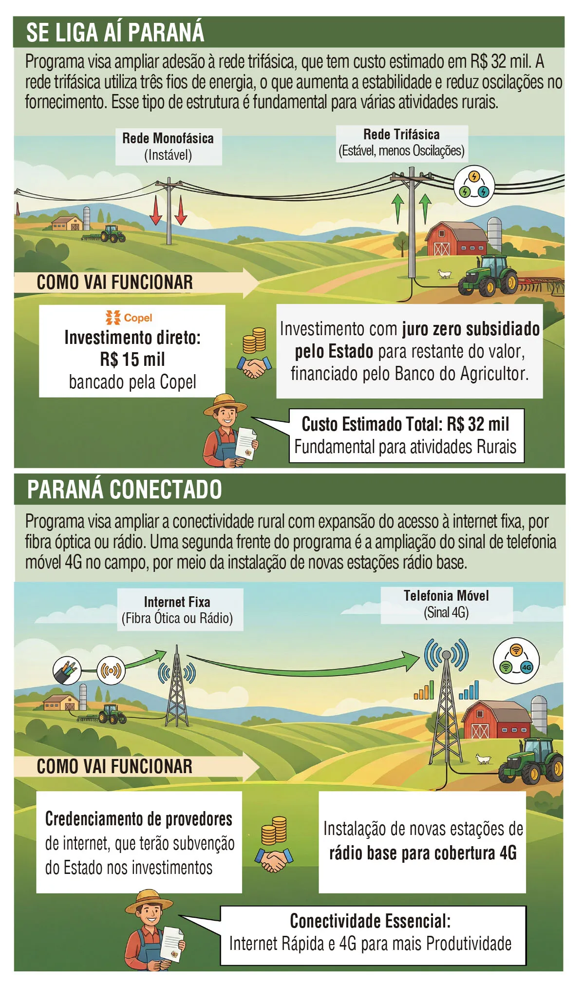 O Paraná Conectado, programa que será instalado de forma piloto no Vale do Ivaí para abranger 33 municípios, foi estruturado para ampliar a conectividade rural por meio de duas frentes complementares. A primeira é a expansão do acesso à internet fixa, por fibra óptica ou rádio.