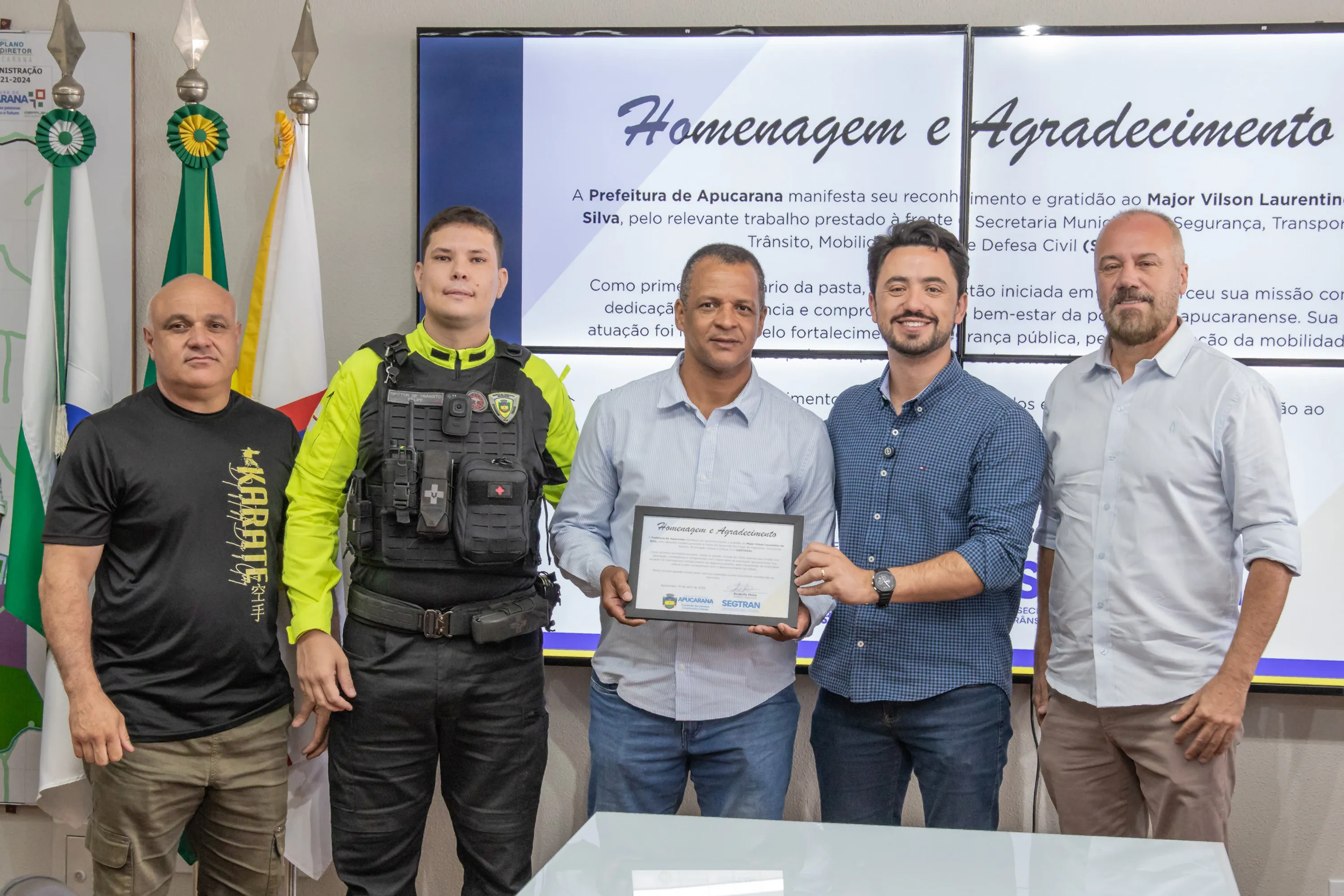 O prefeito de Apucarana Rodolfo Mota oficializou, na manhã de ontem, a troca de comando na Secretaria de Segurança, Transporte, Trânsito, Mobilidade Urbana e Defesa Civil (Segtran). O subtenente Almir Freitas, que ocupava o cargo de superintendente na pasta, assume o posto em substituição ao major Vilson Laurentino da Silva, que se afasta da função para iniciar um tratamento de saúde.