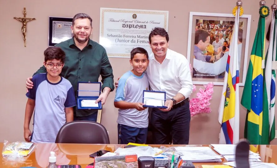 O prefeito Junior da Femac recebeu ontem, no Dia do Prefeito, uma visita especial de alunos da Escola Adventista de Apucarana. ‘Na aula de civismo’, estudantes do 5º ano foram recebidos no gabinete e entregaram uma placa de reconhecimento ao gestor e também ao vice, Paulo Vital. Além de receber a lembrança, Júnior também respondeu a várias perguntas de seus visitantes. Como gentileza pela visita, Junior deu a cada um dos estudantes um exemplar do “Alma e História das Ruas de Apucarana”, que narra a trajetória de 25 personalidades que dão nome às principais ruas da área central da cidade.